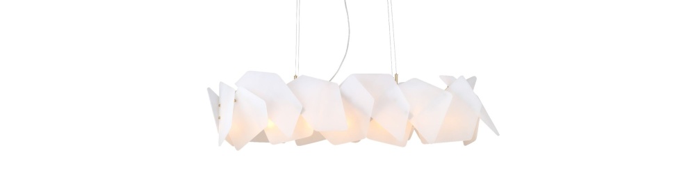 Ключевые преимущества коллекции: геометричный дизайн — объемный плафон из акриловых пластин, две формы — круглая (диаметр 60 см) и вытянутая (120×30 см), современные материалы — матовый акрил, металлическая арматура, универсальность — для гостиной, столовой, кухни, бара, безопасность для потолков — можно монтировать на натяжные потолки, лёгкость конструкции — минимальная нагрузка на крепление.
