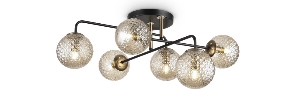 - Палитра: Коллекция представлена в эффектном сочетании матового черного металла и акцентов в цвете латуни. Золотистые элементы в сочетании с прозрачными плафонами придают светильникам благородный и дорогой вид, характерный для стиля «современная классика».