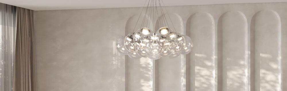 Центральный элемент коллекции — идеальный шар из дутого стекла. В зависимости от композиции, это может быть как одиночная лаконичная сфера, так и эффектная группа из множества шаров разного диаметра, закрепленных на едва заметных подвесах. Такая конфигурация создает иллюзию левитации: тяжелое стекло кажется невесомым, наполняя комнату динамикой и воздухом. Направление света — всестороннее, что позволяет мягко и равномерно освещать каждый уголок помещения, исключая резкие тени.