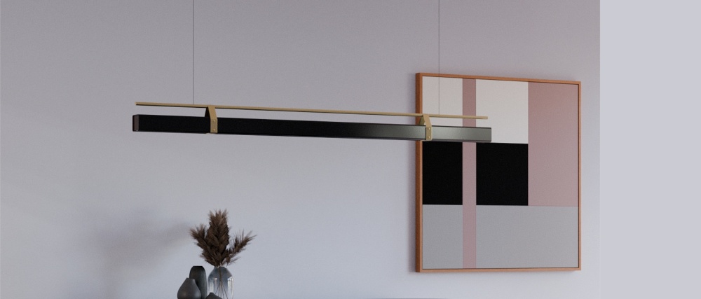 Визуальный образ коллекции строится на принципах строгого геометризма. Основная форма — совершенная горизонтальная линия. Тонкий, вытянутый корпус-балка кажется невесомым, паря в пространстве на почти невидимых тросах. Светильники напоминают лазерные лучи или элементы футуристичного офиса будущего, подчеркивая динамику и масштаб современного интерьера.