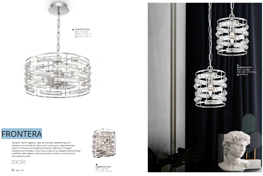 Основной чертой подвесных светильников серии Frontera Maytoni является каркас из прозрачных кристаллов. Они формируют конструкцию и соединяются друг с другом с помощью хромированной арматуры. Светильники создадут неповторимую атмосферу и станут ярким акцентом в интерьере. Серия включает в себя бра и два подвесных светильника, высоту которых можно изменить, регулируя длину цепи.