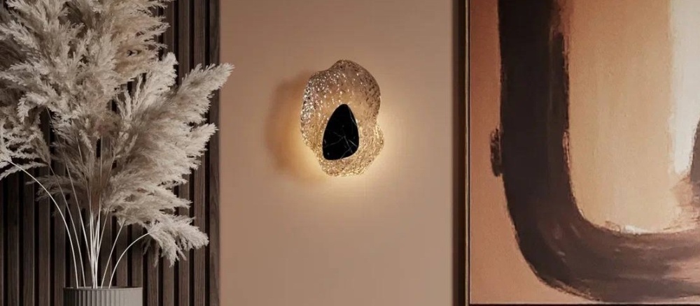 Стеклянный рассеиватель проецирует на стену динамичные блики, похожие на игру света на воде. Центром композиции служит декоративный элемент из натурального мрамора или металла, подчеркивающий природную эстетику коллекции. Coralla — это не просто свет, а настоящее произведение искусства для ваших стен.