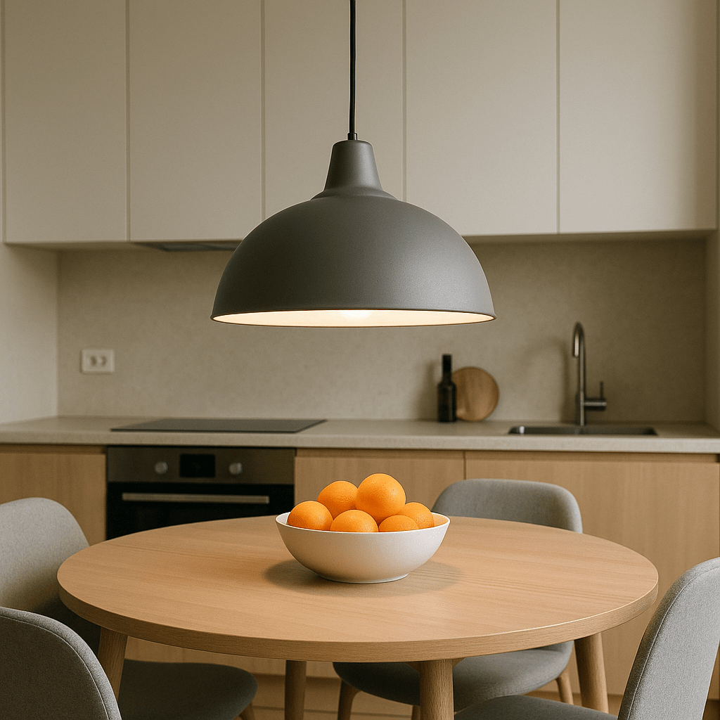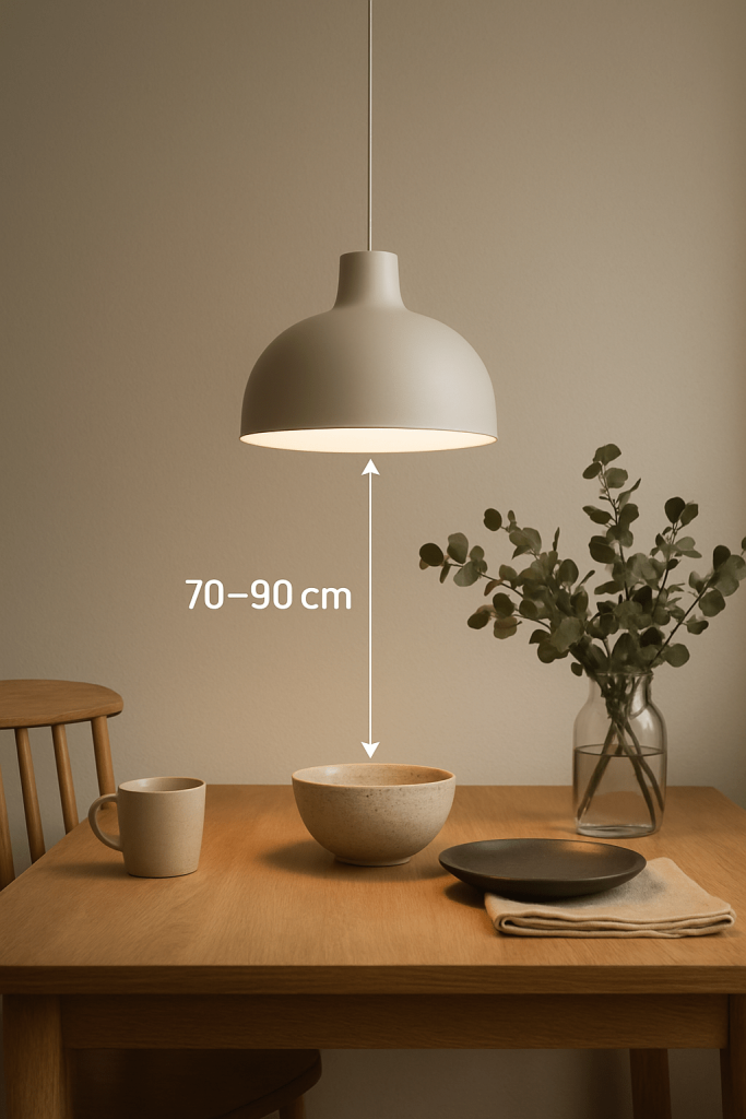 Правильно: низ люстры на уровне 70–90 см от столешницы — комфортный свет без бликов.Ошибка: слишком низкий подвес перекрывает обзор и ослепляет сидящих за столом.
