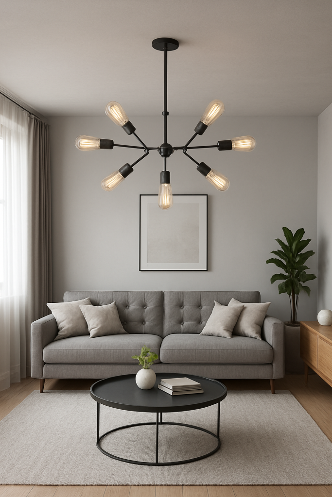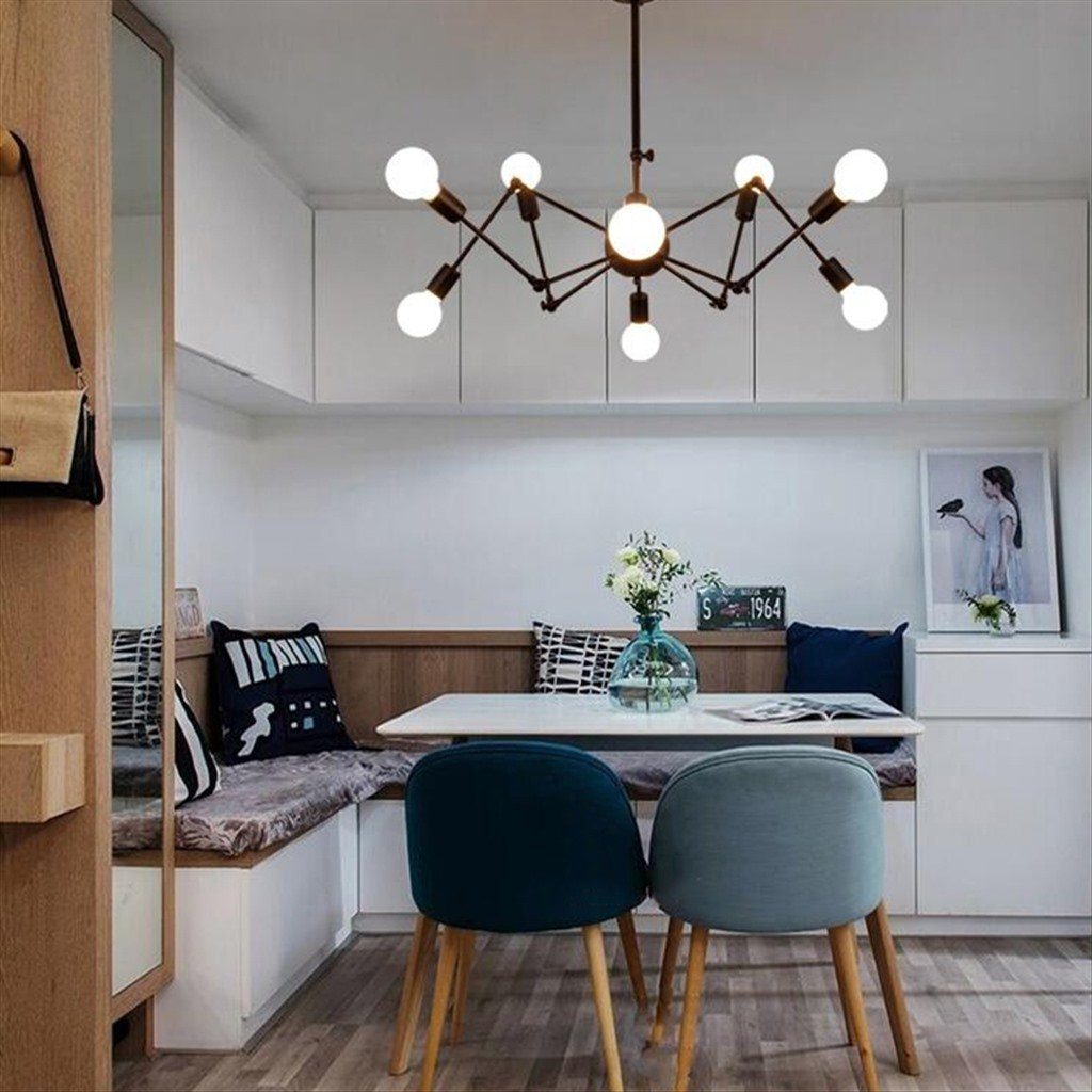 Для гостиной востребована модель «паук» — большая конструкция, в которой лампочки располагаются на концах каркаса, напоминая паучьи лапки. Вариант с гибкими подвесами позволяет фиксировать лампочки на потолке или оставлять их свободно свисающими.