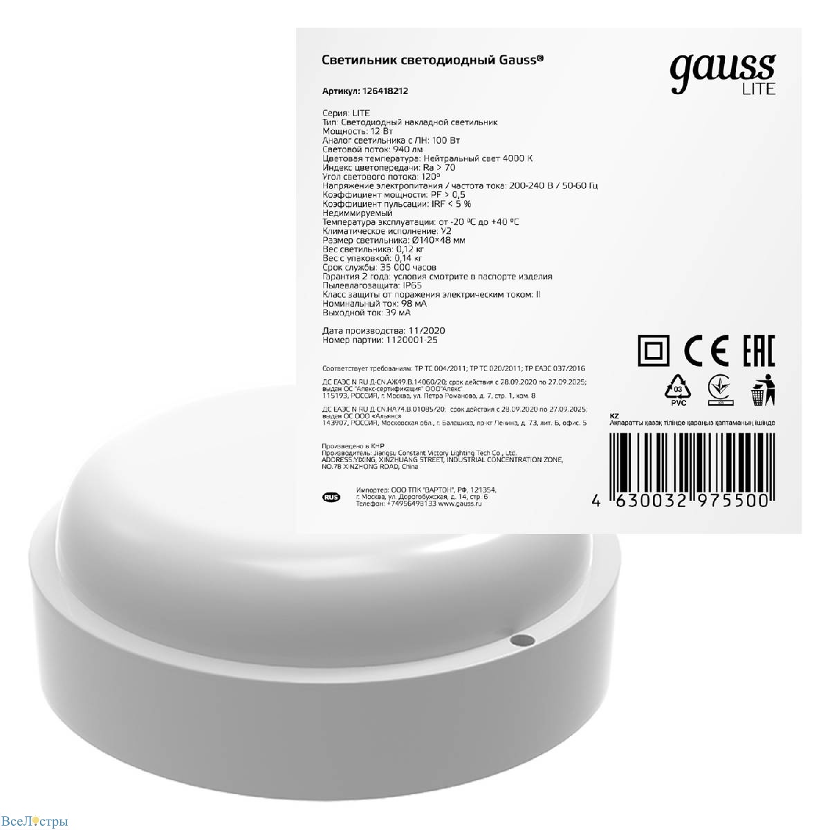 Отзывы про настенно-потолочный светодиодный светильник Gauss Eco IP65 126418212