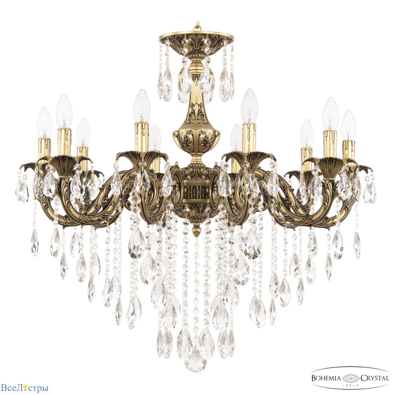 Визуально очень похожа на предыдущую, но с поправкой на геометрию. Здесь другая схема фиксации хрустальных элементов, и свет ведет себя чуть иначе — он более сфокусирован вниз, хотя основная масса остается рассеянной. Десять рожков, два яруса, хрустальный декор. Это тот случай, когда нужно выбирать не умом, а глазом: какая из двух пропорций вам откликается больше. Технически обе безупречны. Площадь освещения — до 25 квадратов, но с учетом декоративной функции, конечно.