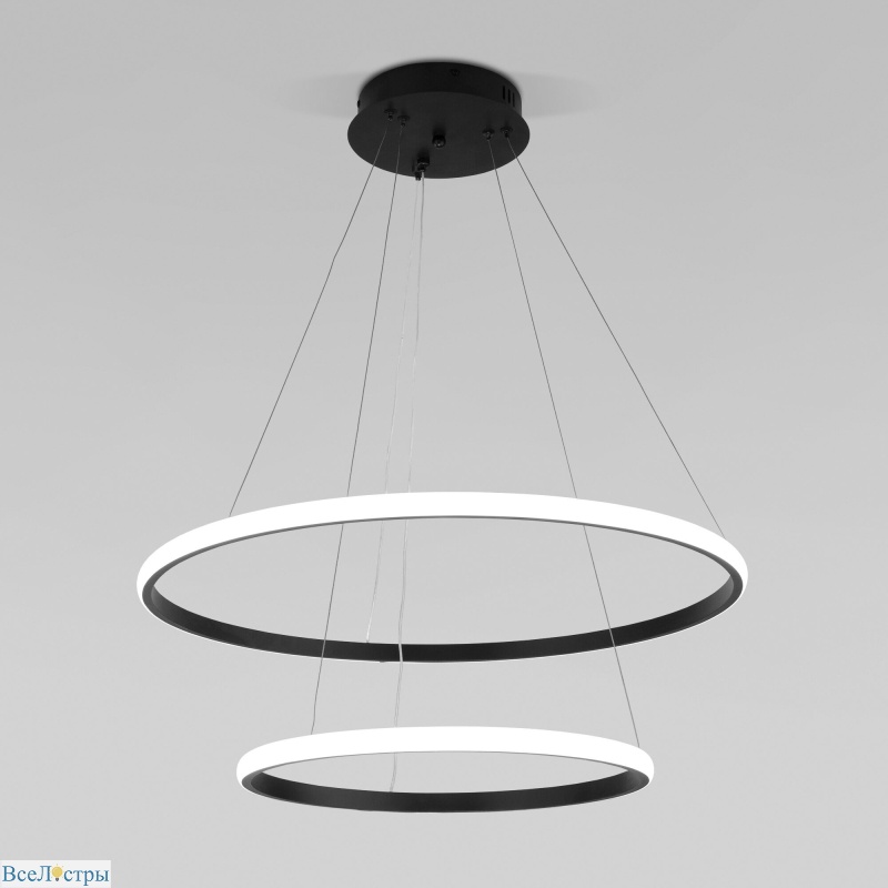 Eurosvet Collars 90264/2 развивает идею минималистичных подвесов: два черных матовых цилиндра расположены на общем основании, создавая ритмичную композицию. Такая люстра идеально подходит для длинных обеденных столов, барных стоек или коридоров, где нужно равномерно распределить свет по площади. Каждый плафон направляет свет строго вниз, не рассеивая его по сторонам, что позволяет осветить рабочую поверхность без лишних бликов. Металлический корпус и потолочная чаша выдержаны в едином черном цвете, подчеркивая графичность форм. Патроны E27 позволяют использовать как светодиодные, так и декоративные лампы. Высота подвеса регулируется, что дает возможность опустить светильники точно на нужный уровень.