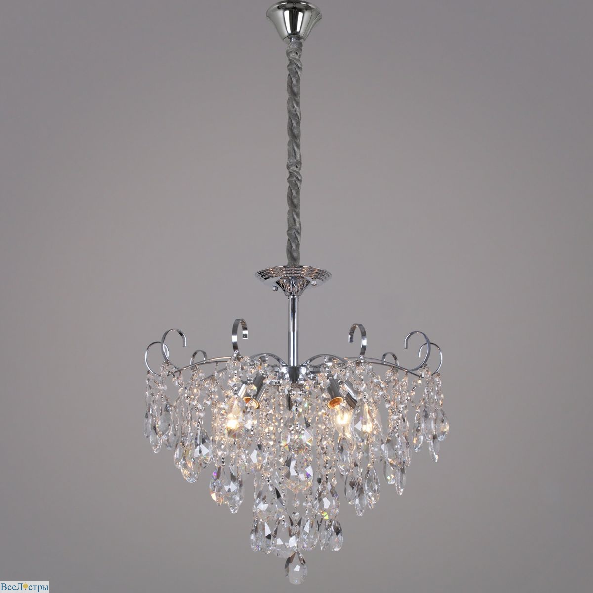 Восьмисотмиллиметровая люстра с открытыми рожками на хромированном основании — выразительный элемент для просторных помещений. Четыре источника света создают скульптурную композицию, которая наполняет комнату объемным и многогранным светом.