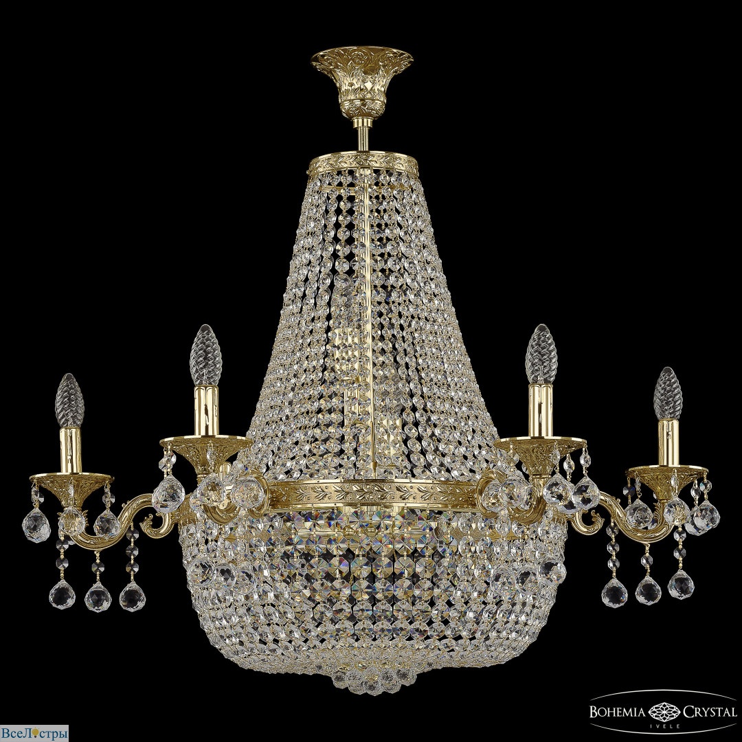 Небольшая, но очень нарядная люстра. Шесть рожков с хрустальными подвесками на золотом каркасе. Идеальный масштаб для спальни средних размеров. Свет будет мягким, с легкими бликами. Важно не перегрузить комнату декором — люстра должна быть главным акцентом. Модель хорошо смотрится как на белом, так и на цветном потолке. Глубина пространства подчеркивается игрой хрустальных граней. Рекомендую матовые лампы-свечи.