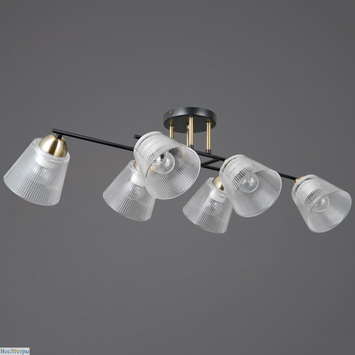 Шестирожковая люстра в современной обработке: сочетание чёрного металла и прозрачного стекла.