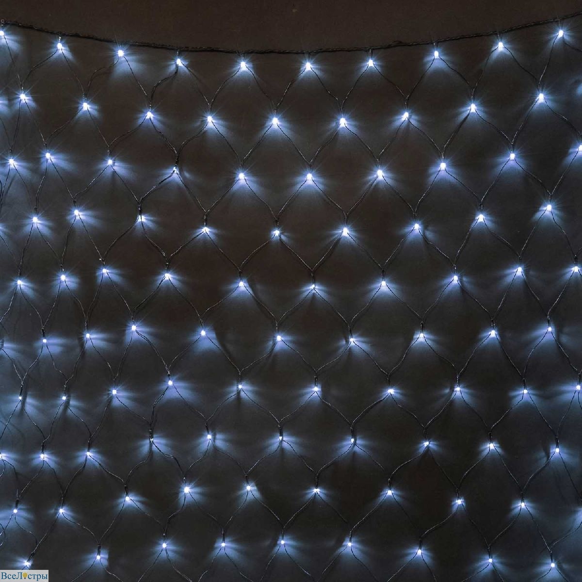 Сеть с другим размером ячейки (NTL384). Белый свет, без колпачков. Даёт более разреженное свечение, чем мелкая сетка. Это позволяет использовать её не как фон, а как самостоятельный рисунок. Можно растянуть на подрамник — получится светящаяся картина. Лаконично и современно.