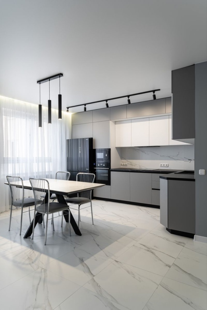 Подвесная же система реализуется с помощью тросовых подвесов. Это очень удобно, если высота ваших потолков больше 3,5 метров. И чтобы максимально эффективно использовать шинную систему освещения, её необходимо немного приспустить, чтобы светильники выполняли свои функции. Но в рамках подвесной системы на тросах нужно помнить, что подвесная шина может раскачиваться, например, при сквозняке. Поэтому есть вариант крепления на жёстких шпильках, который не позволит качаться шинопроводу.